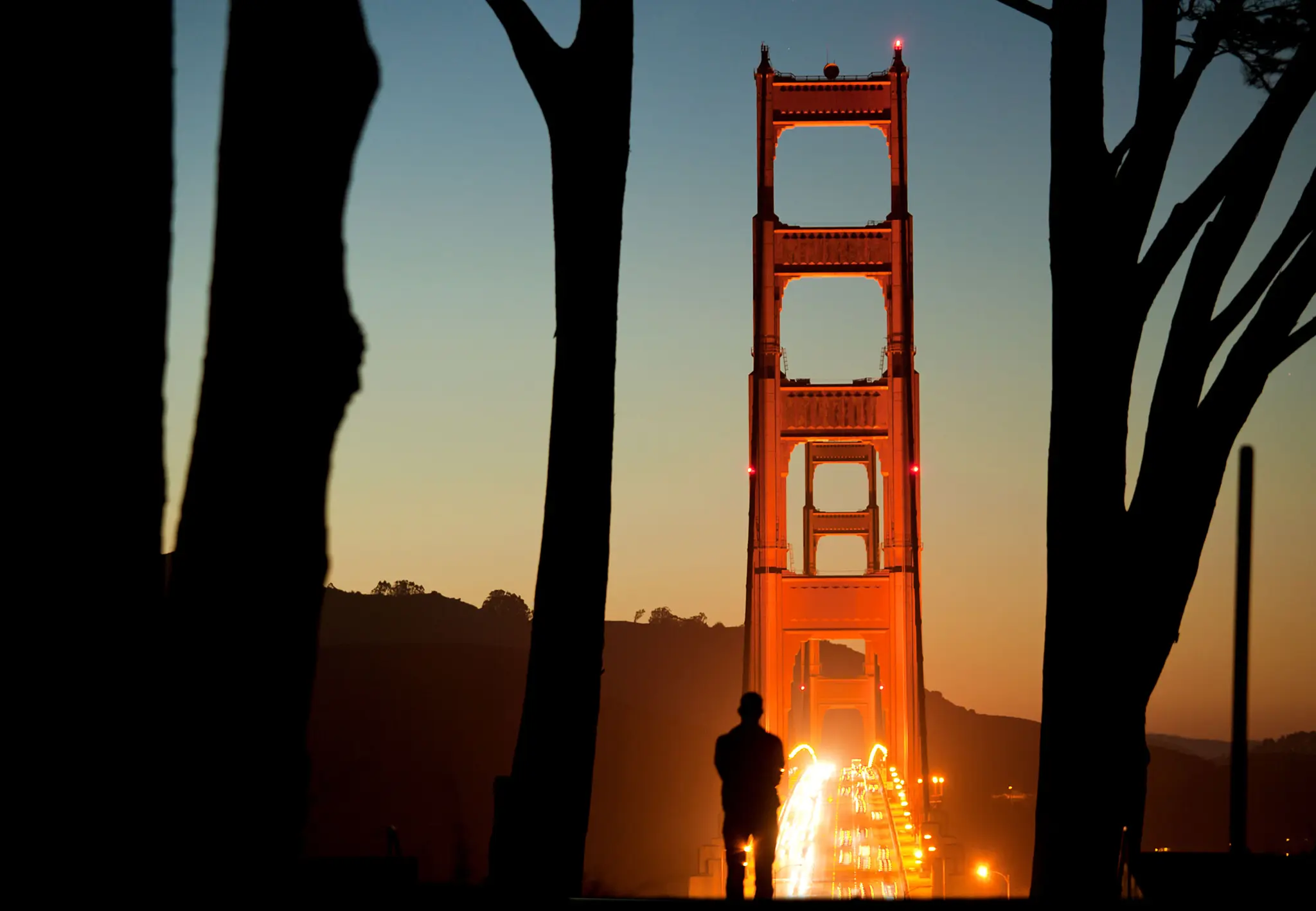 This can’t-miss view features the towers of the Golden Gate Bridge framed between two Cypress trees